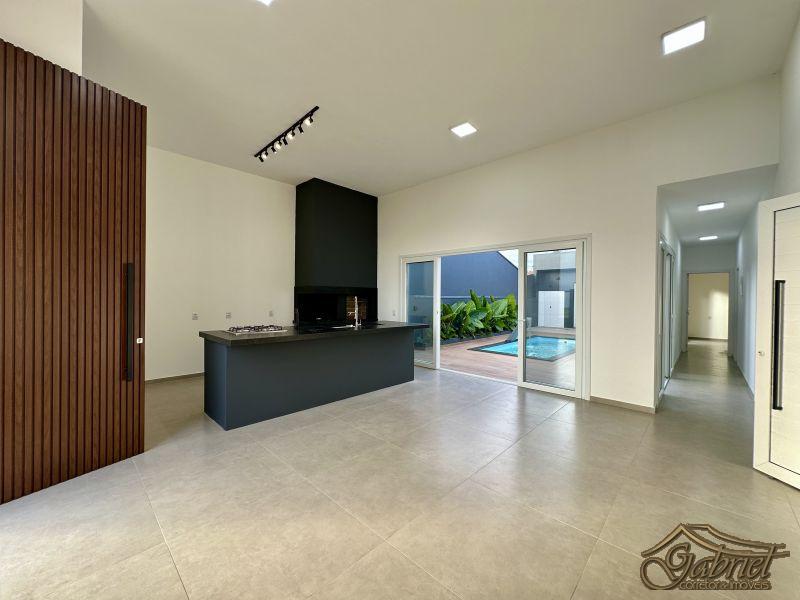 O amplo living integra sala de estar, sala de jantar e cozinha, com pé-direito duplo, proporcionando excelente iluminação e sensação de amplitude. A cozinha é equipada com churrasqueira, bifeteira, bancada em granito, cooktop e pia já instalada, ideal para momentos de convivência.