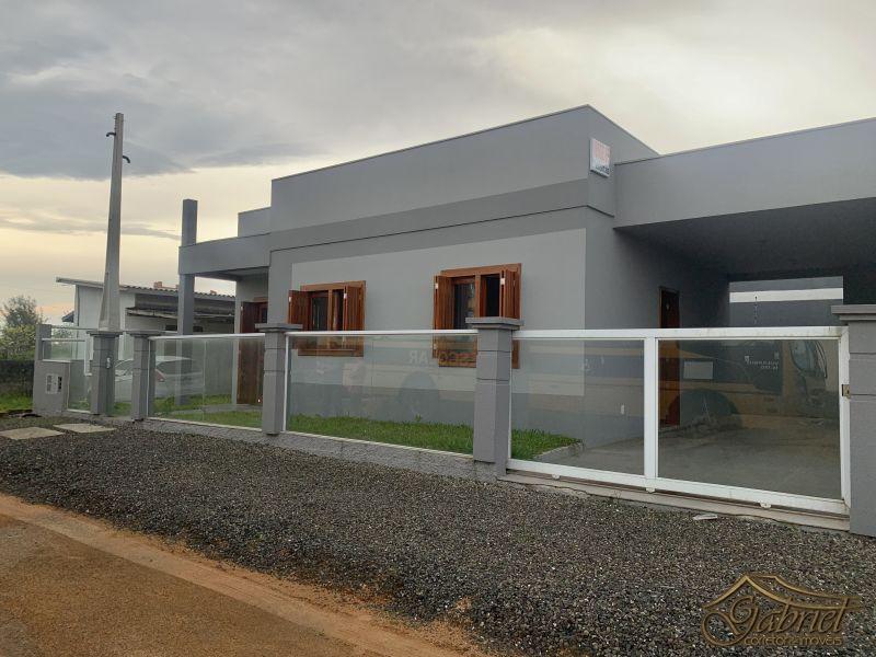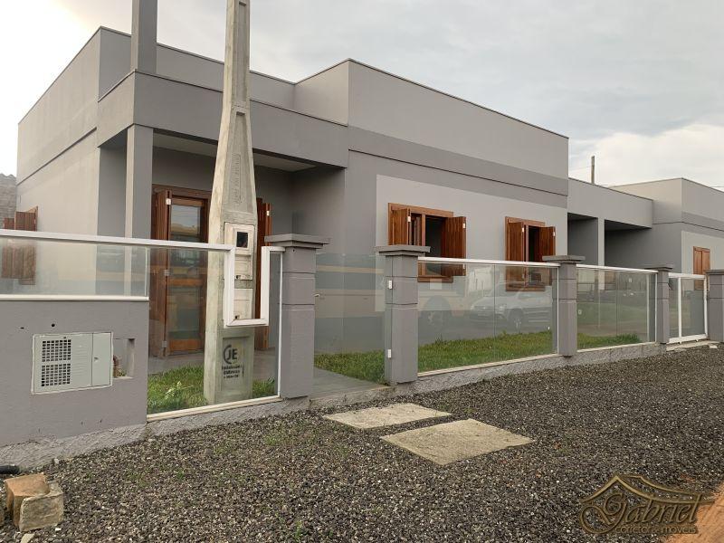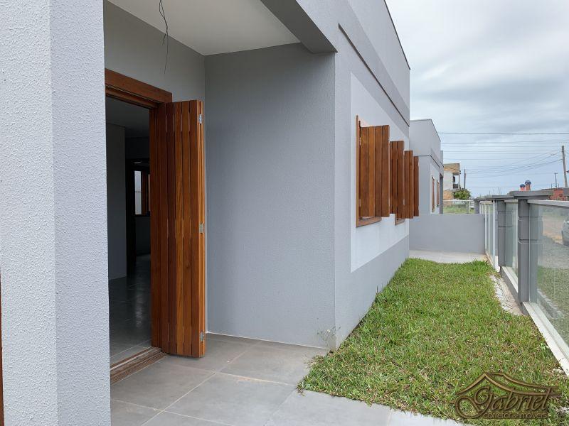 Casa geminada em alvenaria constituída de 3 dormitórios, 1 banho suíte, 1 banho social, sala estar, sala de jantar e cozinha integrada, abrigo para 1 carro com churrasqueira. posição solar frente leste. Com80m² de área construída e um terreno total de 10x15m (150m²). Distante 100m do mar
